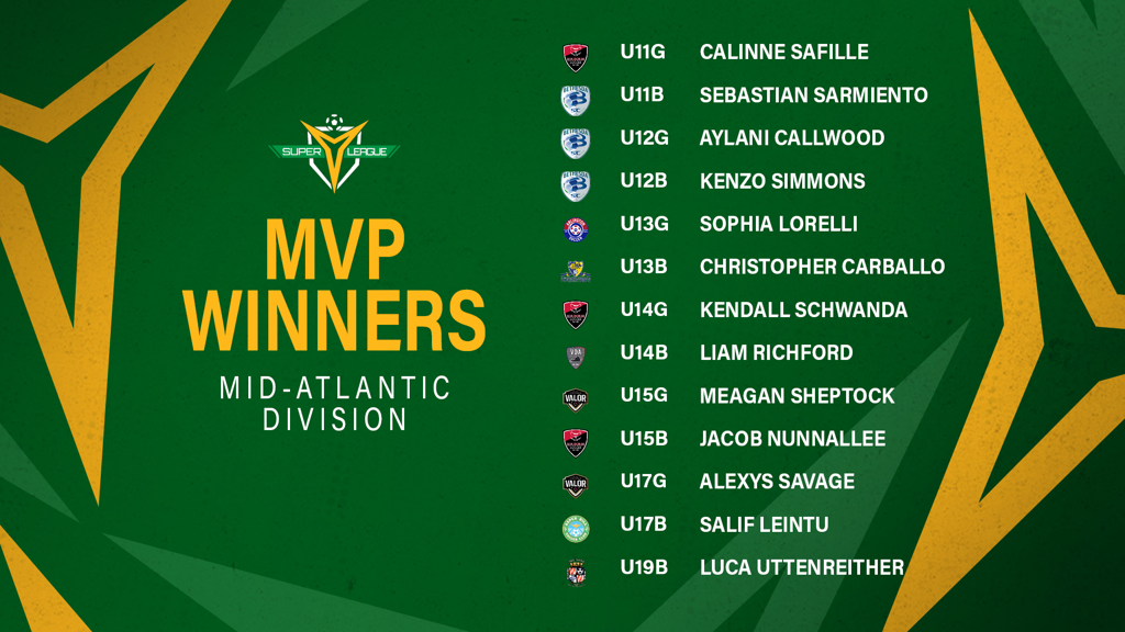 The USL Super Y League is excited to announce the MVP winners in the Mid-Atlantic Division. After a competitive season, these 13 players stood out amongst the tough competition and were voted on by the Super Y League community.